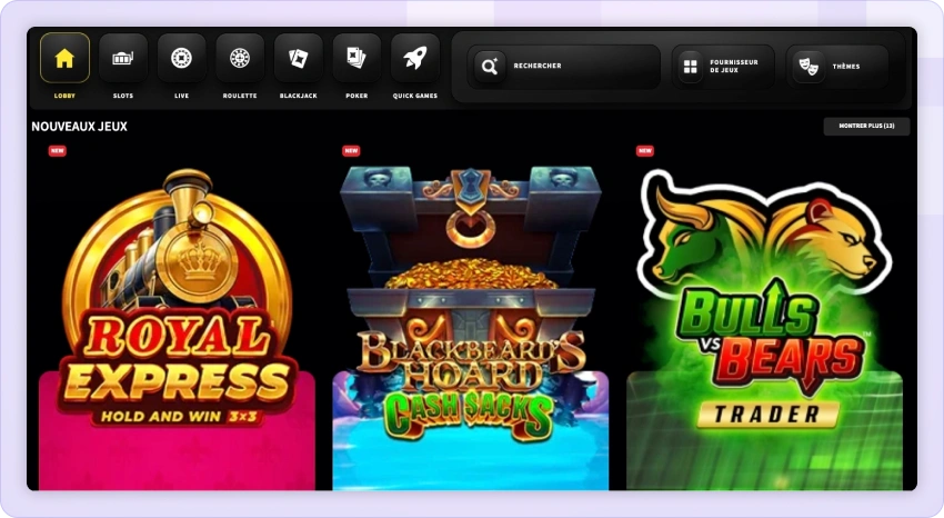 Nous avons particulièrement apprécié la présentation des informations clés (nom, mode démo, fournisseur, mise minimale et maximale) au survol des vignettes de jeux.