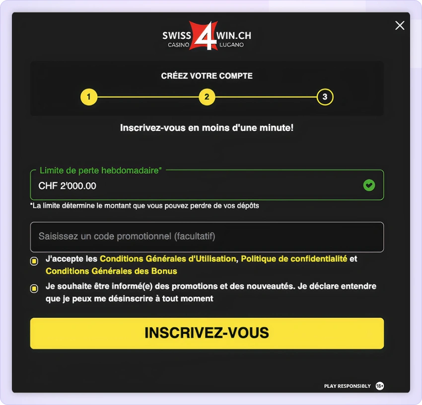 Définissez votre limite de dépense hebdomadaire. Si vous avez un code promo Swiss4Win, entrez-le à cette étape. Il ne vous reste ensuite qu’à accepter les conditions générales et confirmer l'inscription.