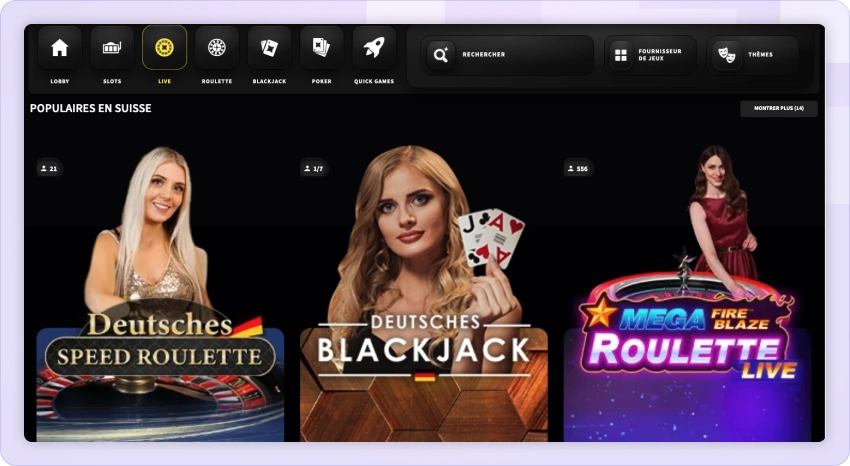 La section live de Swiss4Win offre une expérience immersive, avec des flux vidéo Full HD à faible latence et un son stéréo capté en direct qui restitue l’ambiance d’un vrai casino.