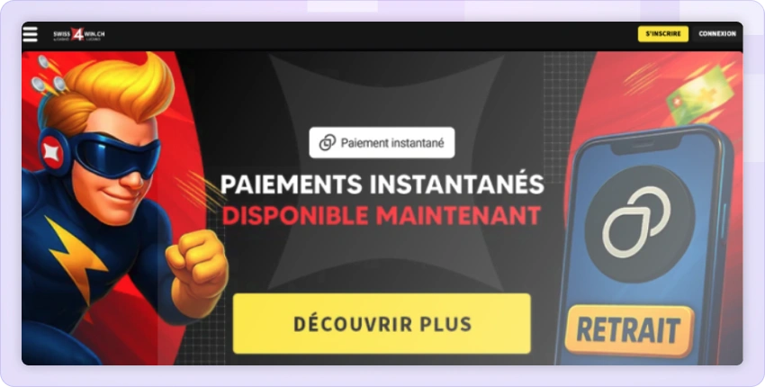 Swiss4Win est un casino en ligne licencié en Suisse et appartenant au Casino Lugano, reconnu pour sa réputation solide. Ses points forts sont un bonus sans dépôt de 150 tours gratuits et des retraits instantanés.