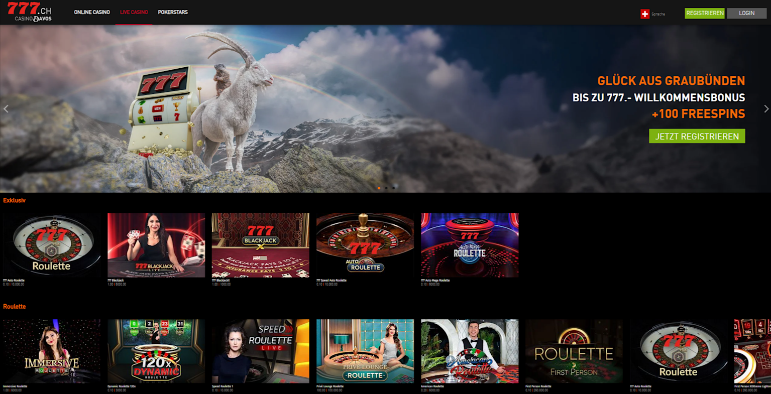 In der Kategorie «Live Casino» erwarten Sie bei 777.ch zahlreiche Live Casino Spiele von beliebten Anbietern wie Evolution Gaming und Pragmatic Play. Die Spiele haben eine hervorragende Videoqualität und garantieren so ein authentisches Casino Erlebnis im ansprechenden Design. Daneben führen Sie echte und professionelle Croupiers und Dealer durch das Spiel. Positiv ist auch, dass Sie am virtuellen Spieltisch in der Sprache Ihrer Wahl spielen können.