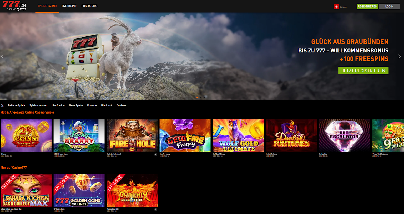 Casino777 ist ein Schweizer Online Casino mit einer offiziellen Konzession. Betreiber ist das etablierte Casino Davos. Hier finden Sie zum einen ein Spielangebot mit mehr als 2'500 Casino Games und Live Casino Spielen. Zum anderen liegt die Casino777 Auszahlungsquote mit 98,50 % über dem Durchschnitt laut unseren anderen Casino Tests.